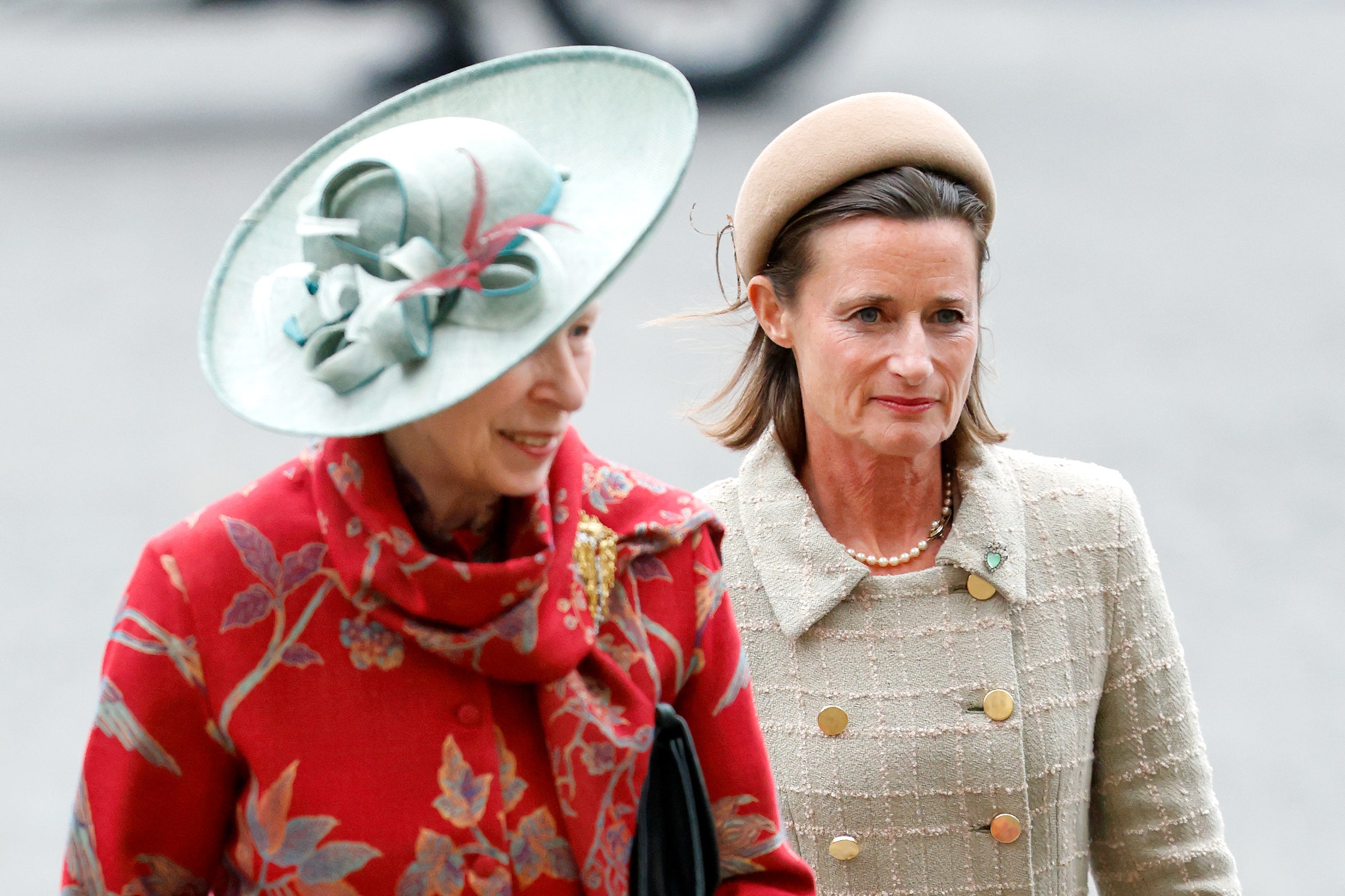 The Princess Royal, aged 73, was accompanied by the elegant Dolly, 51, who donned a chic coat dress and a striking brown hat, while Anne herself stood out in a vibrant red coat dress adorned with colorful details over a blue dress, injecting a splash of color into the abbey surroundings.