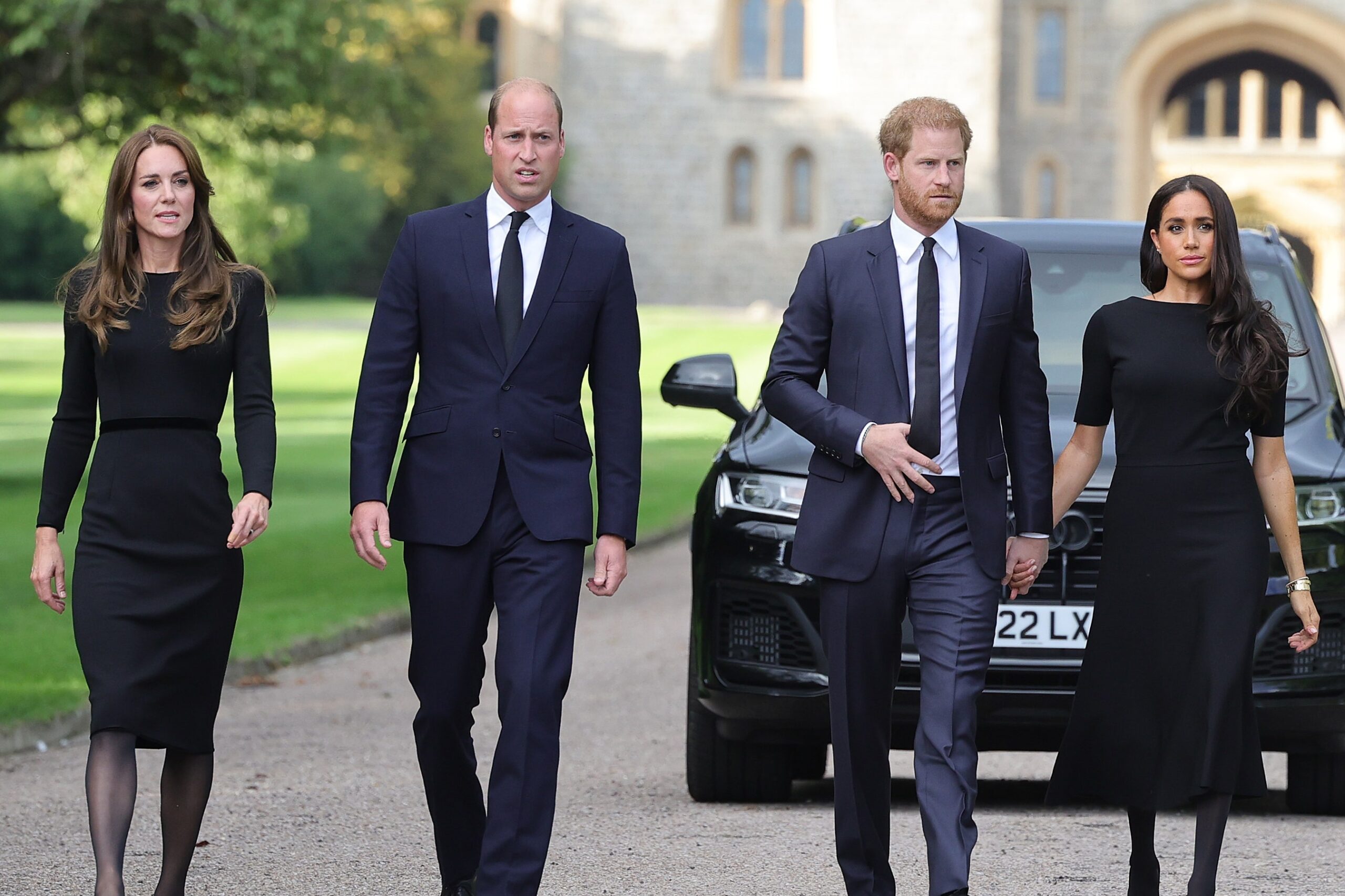 Kate wore a black Alexandra McQueen coat, pearl drop earrings, and a black wide-brimmed Tiffany hat.
