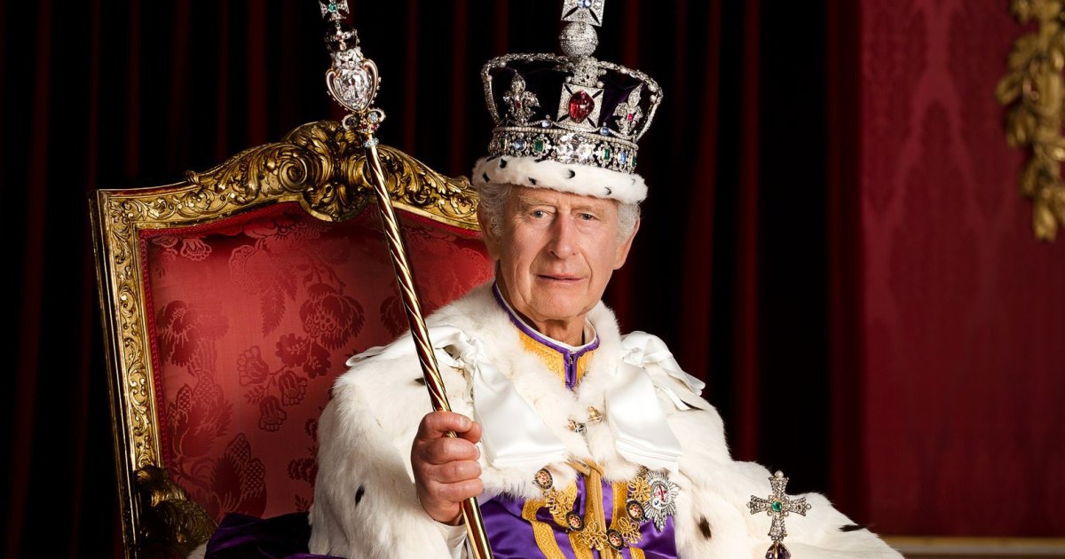 With a charming smile, she stands beside King Charles, who is dressed in his regal robes and the imperial state crown.