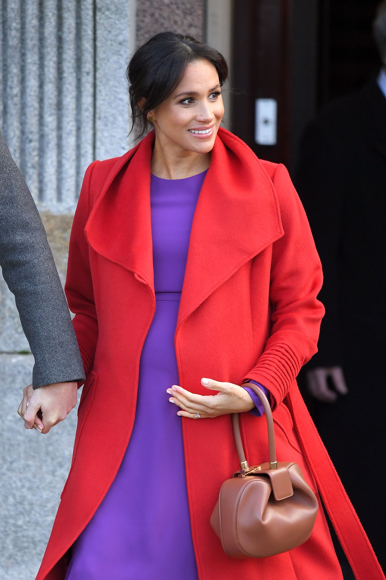 Meghan chose a monochrome look with two tones of brown, wearing 1,200lb wide leg silk trousers from Gabriel Hurst.