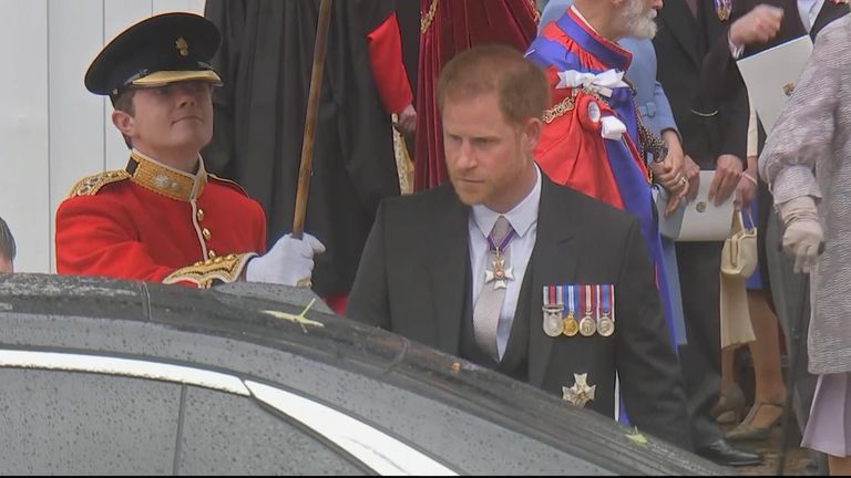 New images captured shortly after the conclusion of the coronation show Prince Harry being escorted into a luxurious car, while the rest of his family returned to Buckingham Palace for the iconic balcony waving and flypast moment.