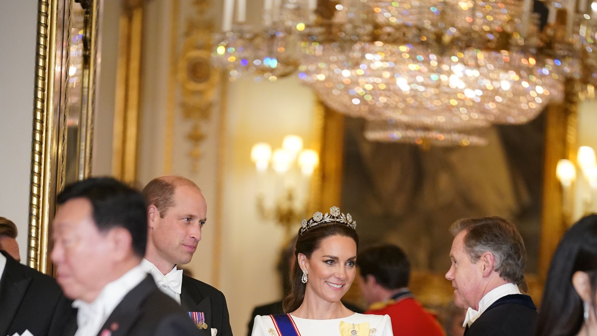 The glamorous event took place at Buckingham Palace, where Princess Kate arrived looking absolutely stunning in a white gown and exquisite jewelry.