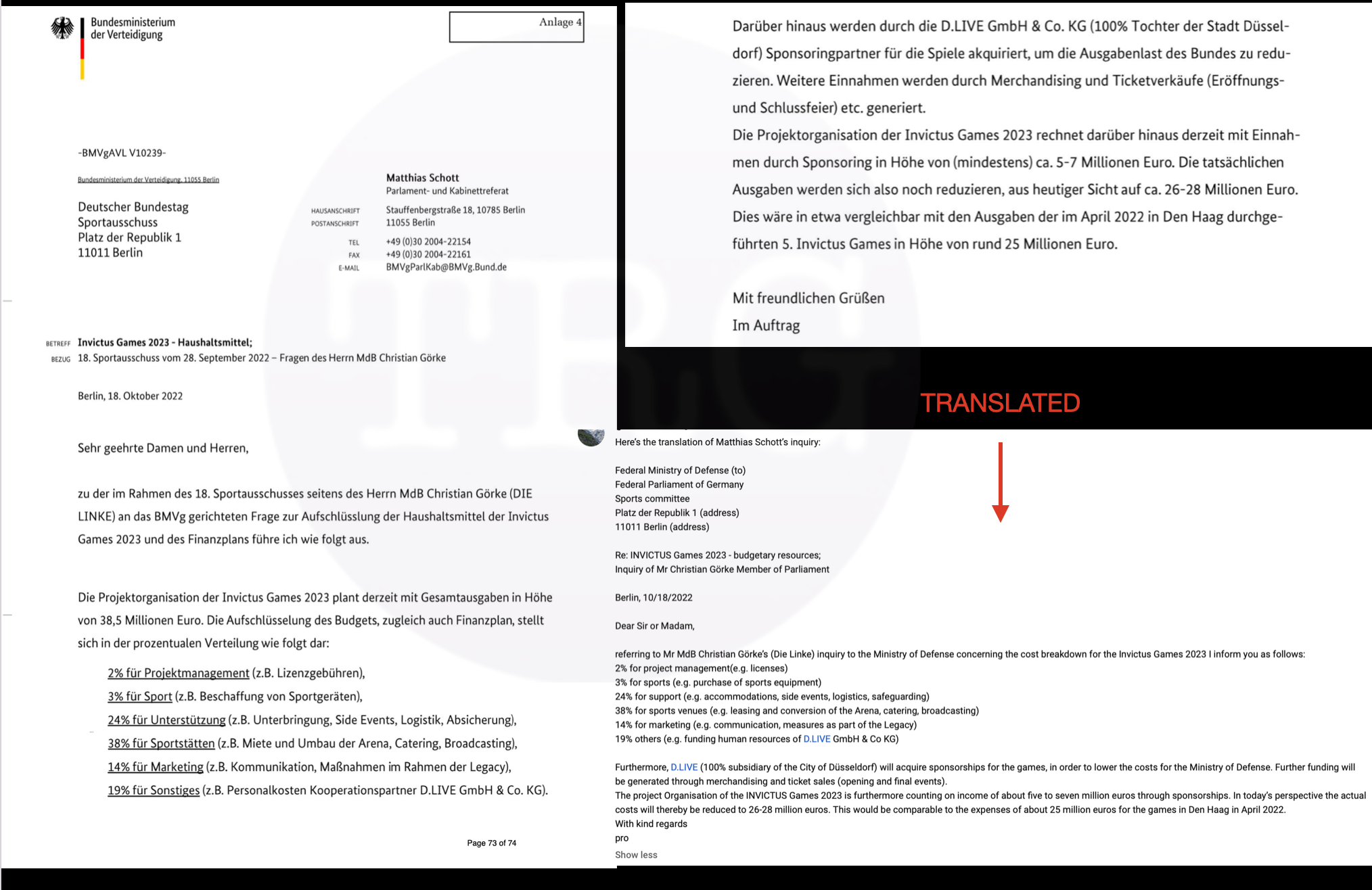 The German letter, which has come to light, exposes the Invictus budget exceeding a staggering $40 million.